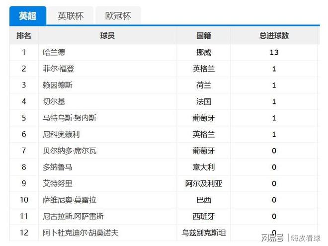 哈蘭德有多么重要,問問曼城,問問挪威就知道了,超級中鋒的存在,真的可以確保一支球隊的下限。盡管曼城的中場,因為各種原因,還在不斷調(diào)整當(dāng)中,唯一不變的前面那個人,只要那個男人保持健康,保持狀態(tài),進球往往就等于勝利??纯绰堑挠⒊爟?nèi)射手榜,應(yīng)該用怎樣的詞語來形容才好呢,一枝獨秀,還是在座的各位都是什么來的?